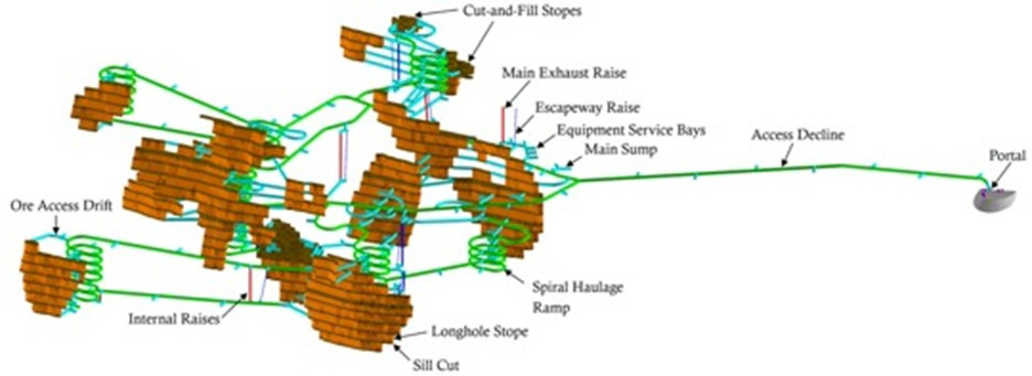 Das Bild unten zeigt eine 3D-Ansicht des Untertagebaus, wenn alle Erschließungs- und Produktionsarbeiten abgeschlossen sind.