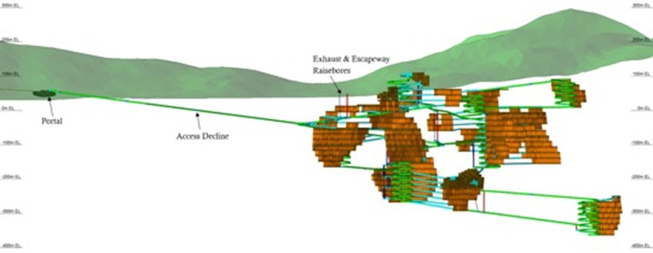 Der Zugang zur Mine erfolgt über einen 900 m langen Stollen, der von einem oberirdischen Portal ausgeht. Ein Schachtabteuf ist nicht erforderlich. Die Belüftung und ein sekundärer Fluchtweg werden über Raise Boring (Aufwärtsbohrung) zur Oberfläche geschaffen. Förderrampen werden schrittweise ausgebaut, um alle Abbaugebiete innerhalb der verschiedenen Erzgänge zu erschließen. Es wird davon ausgegangen, dass die Minenerschließung von einem Auftragnehmer durchgeführt wird und im Zuge des Vortriebs Deckenbohrungen sowie Druckinjektionen umfasst, um potenzielle Wassereinbrüche zu kontrollieren. Keiner der unterirdischen Stollen liegt unterhalb des Herbert-Gletschers.