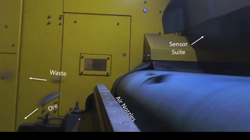 Das Fördergestein wird auf eine Korngröße von maximal 100 mm zerkleinert und einem sensorbasierten Erzsortierverfahren unterzogen, bei dem jedes Gesteinspartikel gescannt wird, während es unter einer Sensorreihe auf einem Förderband hindurchläuft. Partikel, die als nicht mineralisiert (Verwässerung) identifiziert werden, werden mittels eines Druckluftstoßes in einen Ausschussbehälter befördert, während die verbleibenden Partikel zum Transport in einen versiegelten Erzcontainer verladen werden. Weitere Informationen zur sensorbasierten Erzsortierung des Materials von New Amalga finden Sie in der Pressemitteilung des Unternehmens vom 8. April 2025.